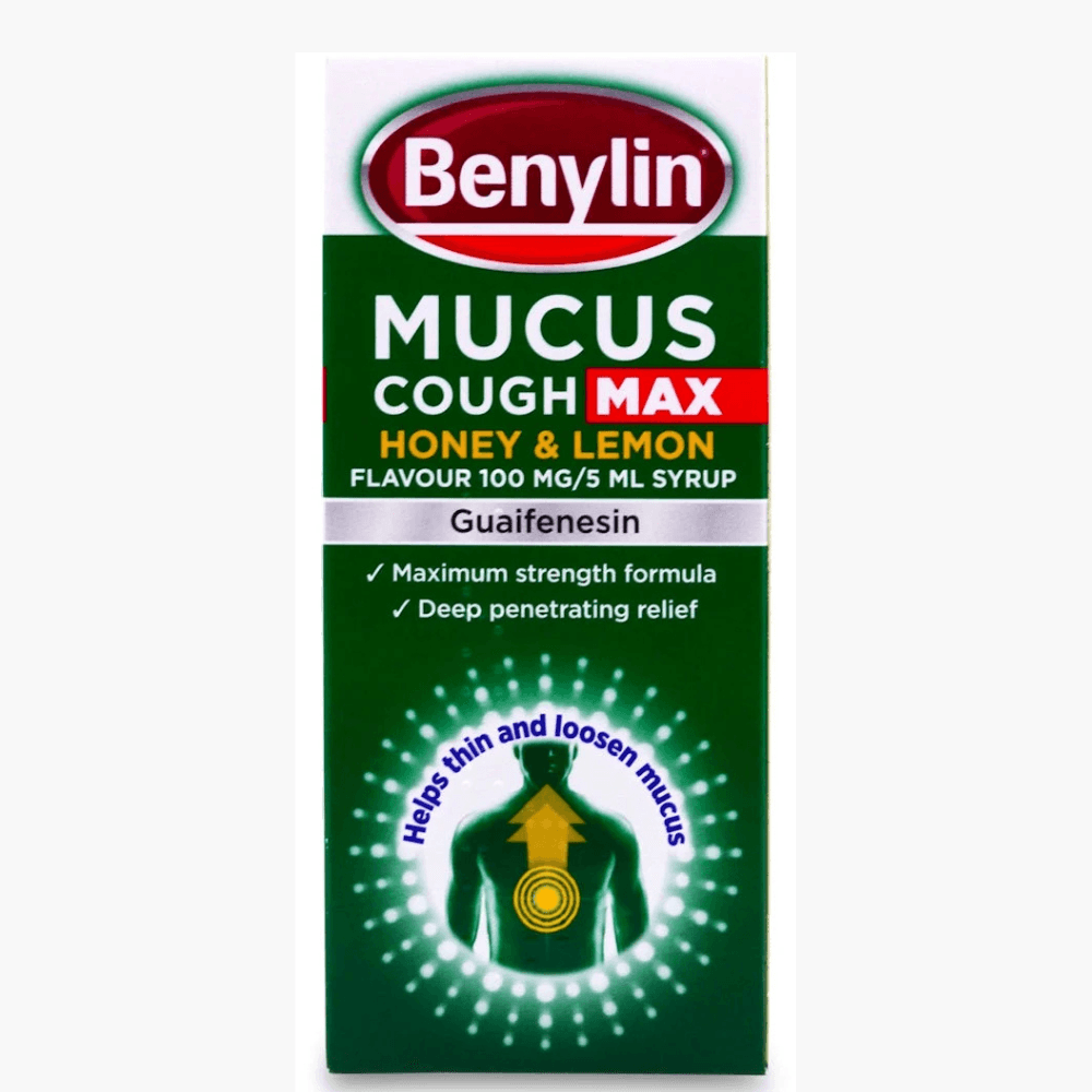 Benylin Mucus Cough Max Honey & Lemon 300ml offers a non-sedative syrup that addresses chesty coughs for adults and young people over the age of 12. Guaifenesin and levomenthol are its primary ingredients, aiding in the expulsion of mucus from the lungs. With honey and lemon flavours, it’s more palatable for consumption.Key FeaturesGuaifenesin aids in the removal of chest mucusLevomenthol offers a calming sensationHoney and lemon ensure a delightful flavorFormula does not induce drowsinessSuitable for those 12 and olderSyrup form for easy ingestionWhat are the benefits of using Benylin Mucus Cough Max Honey & Lemon 300ml?Benylin Mucus Cough Max Honey & Lemon assists in addressing chesty coughs by easing and clearing chest mucus, which helps to reduce the discomfort and congestion that accompanies such coughs.How does Benylin Mucus Cough Max Honey & Lemon 300ml function?Guaifenesin, the primary ingredient, acts as an agent that assists in clearing and easing chest mucus. Additionally, levomenthol has a calming effect.What does research indicate about Benylin Mucus Cough Max Honey & Lemon 300ml?Research supports that guaifenesin, present in Benylin Mucus Cough Max Honey & Lemon 300ml, is efficient in clearing mucus and alleviating chesty coughs.What are the main ingredients in Benylin Mucus Cough Max Honey & Lemon 300ml?In every 5 ml serving of the syrup, there’s 100 mg of guaifenesin. Other components encompass ethanol, glucose, sucrose, sodium citrate, sodium benzoate (E211), and propylene glycol (E1520).How should I consume Benylin Mucus Cough Max Honey & Lemon 300ml?For ingestion only. Those aged 12 and above should take two servings of 5 ml each, four times daily. Refrain from taking more than four servings within 24 hours and don’t give to kids under 12.Can I use Benylin Mucus Cough Max Honey & Lemon 300ml during pregnancy or while nursing?If you’re pregnant or nursing, it’s best to discuss with a doctor or pharmacist prior to using Benylin Mucus Cough Max Honey & Lemon 300ml.How long should I continue using Benylin Mucus Cough Max Honey & Lemon 300ml?In case symptoms persist over a week, it’s advisable to consult a doctor or pharmacist.Guaifenesin 100 mg, Ethanol, Glucose, Sucrose, Sodium Citrate, Sodium Benzoate, Propylene Glycol.