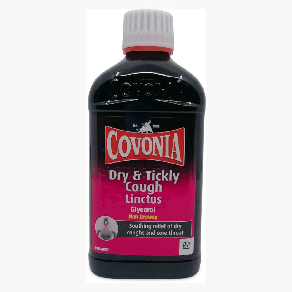 Itchy, scratchy, and sore throat making it hard for you to go about your day? Relief is on hand.Benefits:Covonia Dry & Tickly Cough Linctus, for the relief of the symptoms of coughs and sore throatsContains glycerol which coats the throat to soothe the symptoms of coughs and sore throatsThe brown syrupy liquid is easy and soothing to takeNon-drowsy, so you can go about your daySuitable for adults and children older than one yearSweetened for a pleasant tasteGlycerol 1.35g, Ethanol, Sucrose, Glucose, Propylene glycol, Sucrose 1.7g, Glucose 0.3g (per 5ml).