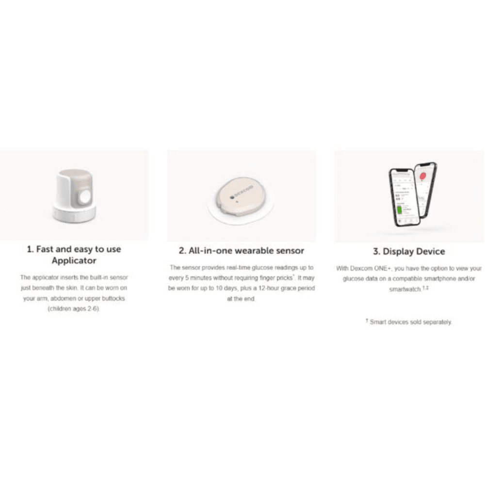 - 9 Dexcom ONE Sensors: Each sensor features an auto-applicator for quick and easy insertion just beneath the skin, providing up to 10 days of continuous glucose monitoring.