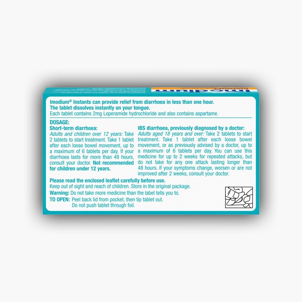 Imodium® Instants dissolve instantly on the tongue with no need to be taken with water. Imodium® Instants provide fast and effective relief and can stop diarrhoea in one hour.
