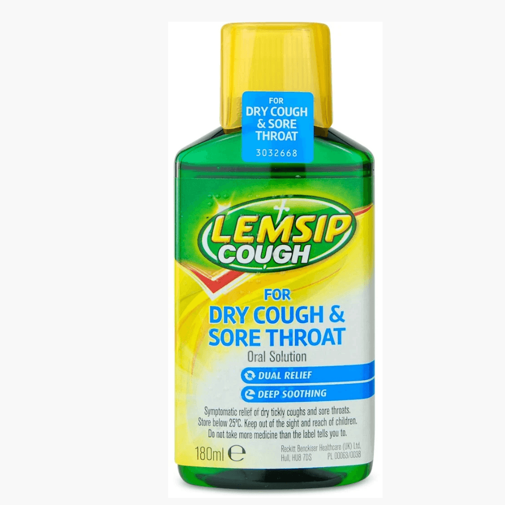 Lemsip Cough for Dry Cough & Sore Throat 180ml offers relief for those experiencing the discomfort of dry coughs and sore throats. This oral solution is designed to coat and soothe the throat, easing the irritation and symptoms associated with a persistent dry cough. The formula includes a blend of ingredients known for their soothing effects, making it an essential item for anyone seeking a convenient and effective way to manage cough symptoms.Key featuresDual relief for dry coughs and sore throats.Composition includes honey, syrup, and glycerol for a soothing effect.Enhanced with lemon terpeneless and citric acid for effectiveness.Appropriate for use by adults and children over one year old.Provided dosing cup facilitates administration while on the move.Liquid format allows for frequent dosing, up to four times a day, to maintain throat comfort.What symptoms or conditions can be treated with Lemsip Cough for Dry Cough & Sore Throat?Lemsip Cough for Dry Cough & Sore Throat is crafted to address the symptoms of dry, tickly coughs and sore throats.What are the benefits of using Lemsip Cough for Dry Cough & Sore Throat?The benefits encompass relief from throat irritation and cough symptoms, along with safeguarding the throat from further irritation.How does Lemsip Cough for Dry Cough & Sore Throat work?Lemsip Cough for Dry Cough & Sore Throat operates by enveloping the throat with a soothing mixture, including honey and glycerol, to alleviate soreness and diminish coughing.Can I take Lemsip Cough for Dry Cough & Sore Throat if I am pregnant or breastfeeding?It is generally deemed safe, however, it is advisable to avoid use during the initial trimesters of pregnancy and while breastfeeding unless the potential benefits justify the risks.Can I take Lemsip Cough for Dry Cough & Sore Throat with other medications?Lemsip Cough for Dry Cough & Sore Throat can be used concurrently with other over-the-counter pain relievers, such as paracetamol or ibuprofen, provided they are deemed suitable for you.Active ingredients: Contains honey, syrup, glycerol, citric acid and lemon Additional ingredients: Also contains the non-active ingredients ethanol, E214, E218, E216 and water. Lemsip Dry Cough and Sore Throat Liquid is specially formulated for providing symptomatic relief of dry tickly coughs and sore throats.
