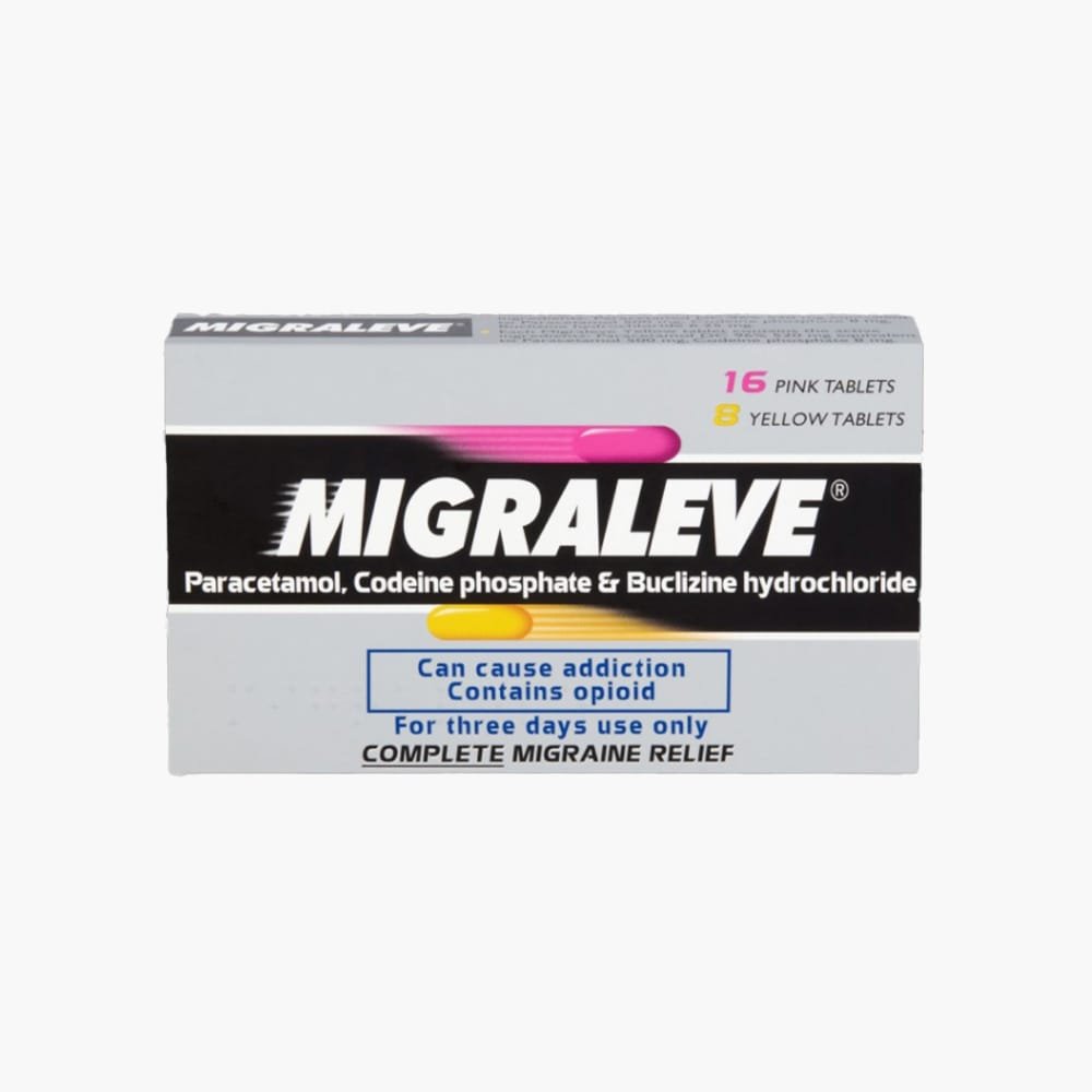- Dual-Action Formula: Migraleve™ Pink Tablets combine paracetamol, codeine, and buclizine to ease pain, relieve nausea, and prevent an attack from developing when taken at the first sign of a migraine. Migraleve™ Yellow Tablets, to be taken after the Pink dose, provide ongoing pain relief.
